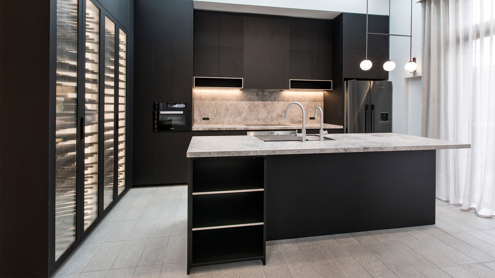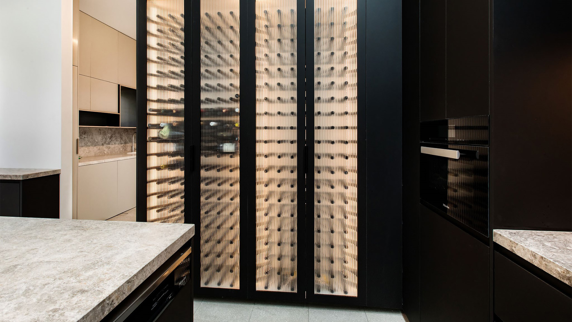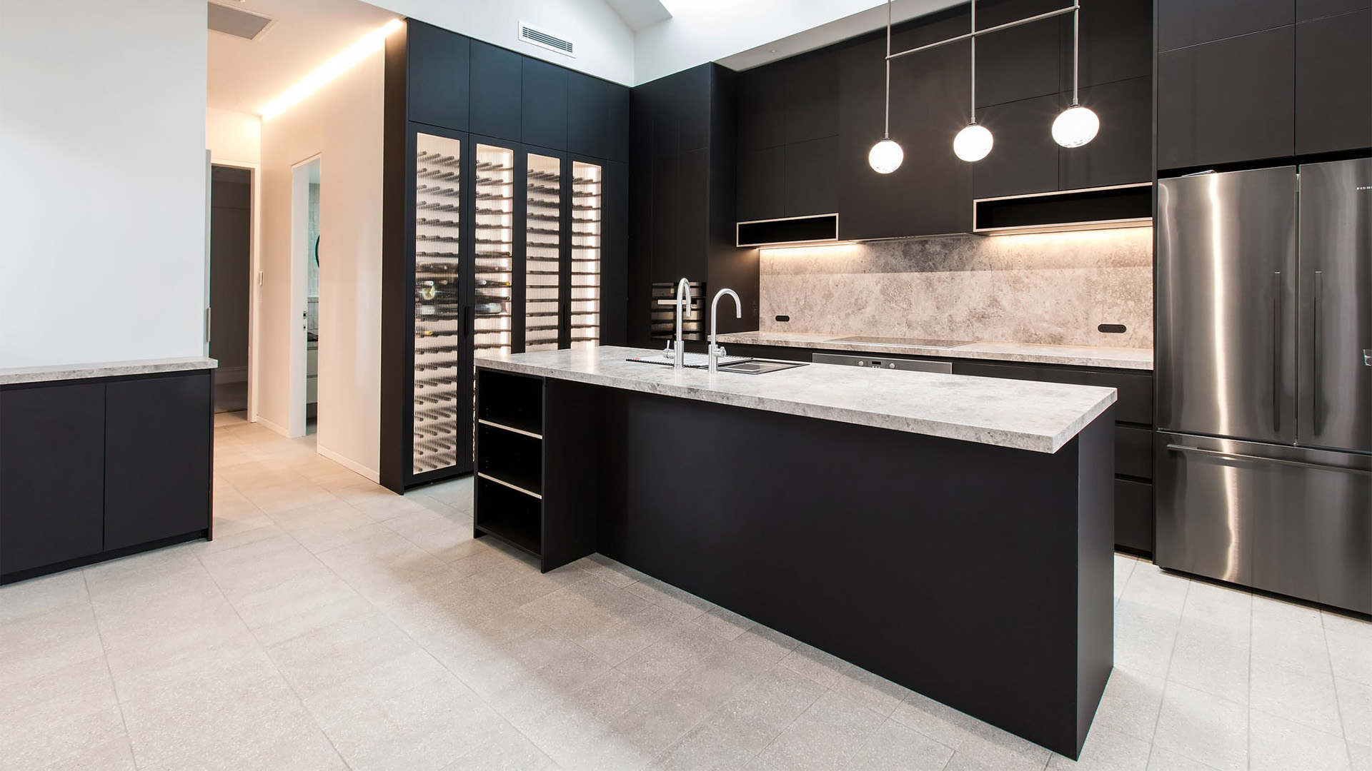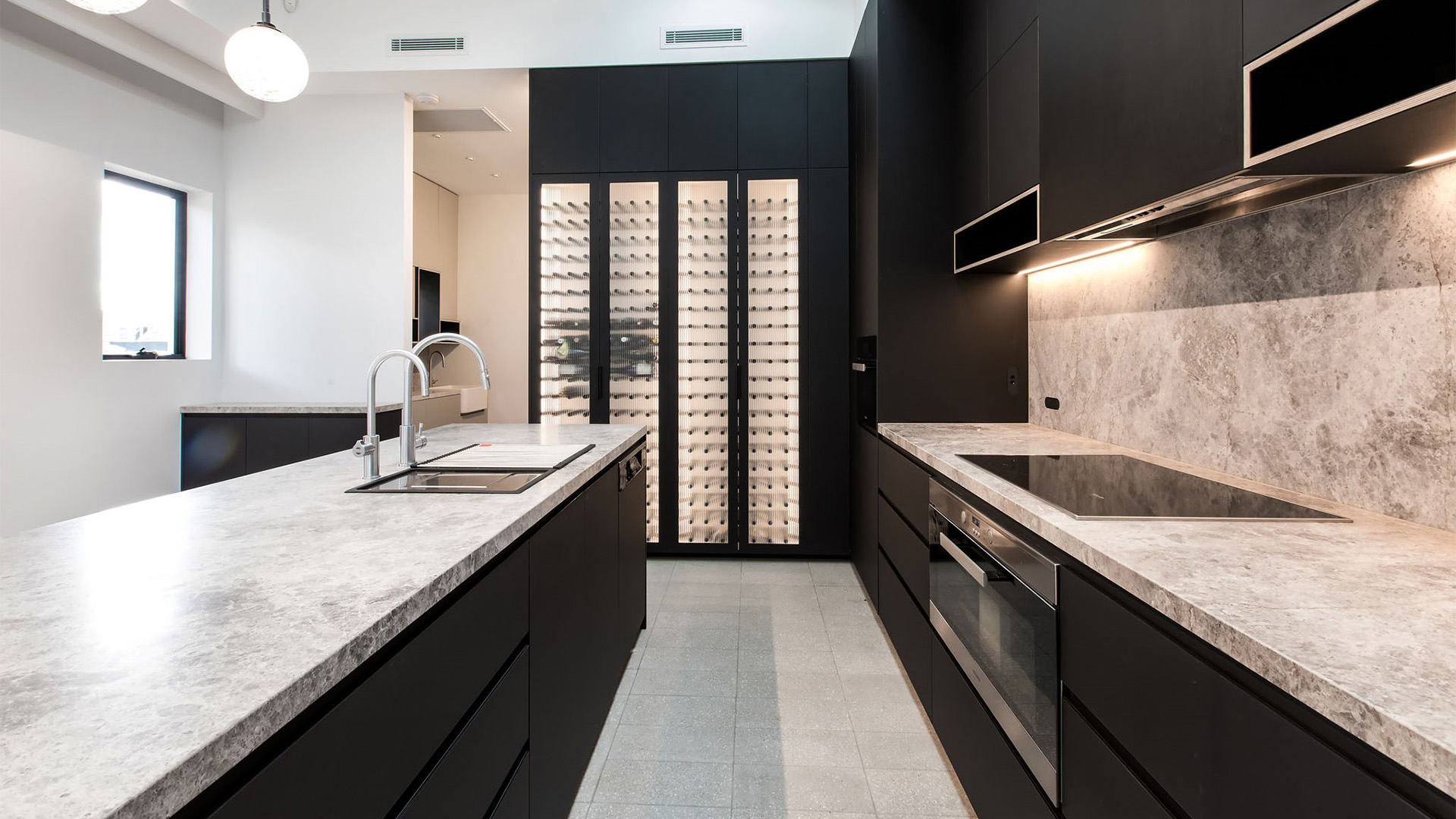 Modern homes go hand in hand with a taiolred sleekness that have functionality at the forefront of their designs. With its white walls, black joinery and grey countertops, this kitchen resembls a contemporary trifecta. It boasts a carbon black anti finger print finish on all joinery alongside a custom fitted wine cabinet with inner LED lighting. The innovative ideas this home posses will carry nicely over time.