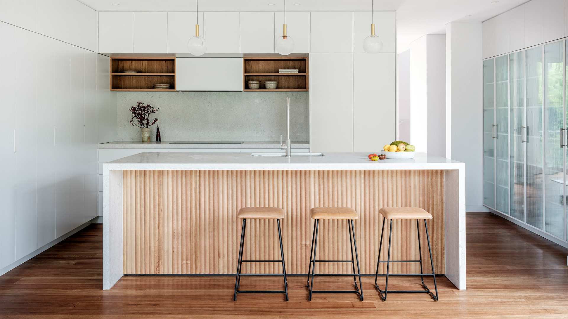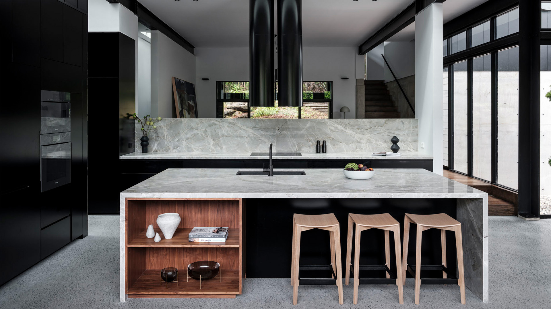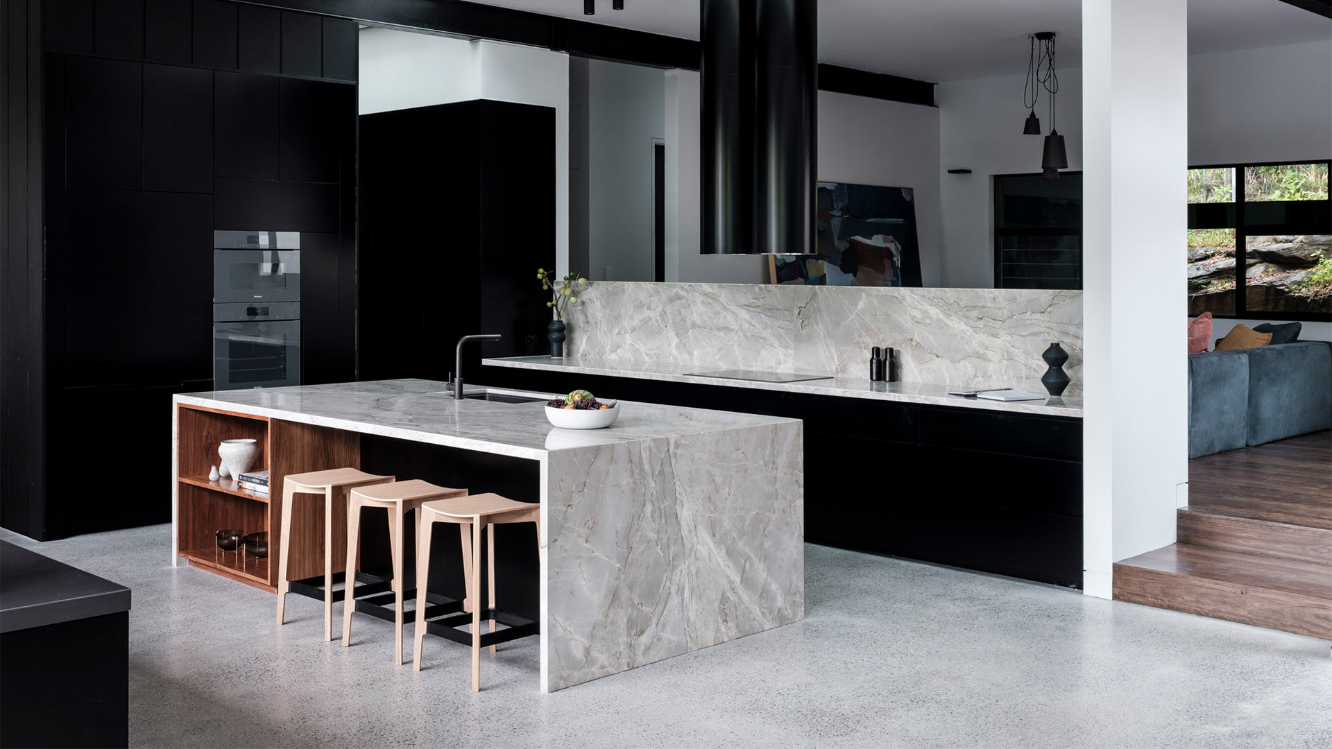 Black offers a sophistication that no other colour can embody. It really masters the defination of both bold and beautiful. The incorporation of a cool marble in this kitchen gives a certain lightness to the space, allowing these two colours to bounce off each other haromoniously. With push to open cabinetry and finger pull draws, a seamless functionality flows through the kitchen. Sometimes the choice of not adding hardware can speak volumes. We followed the tone of joinery throughout the house and by doing this, adding a splash of colour to the laundry became an effortless choice that commented on the natural beauty this home posses.
