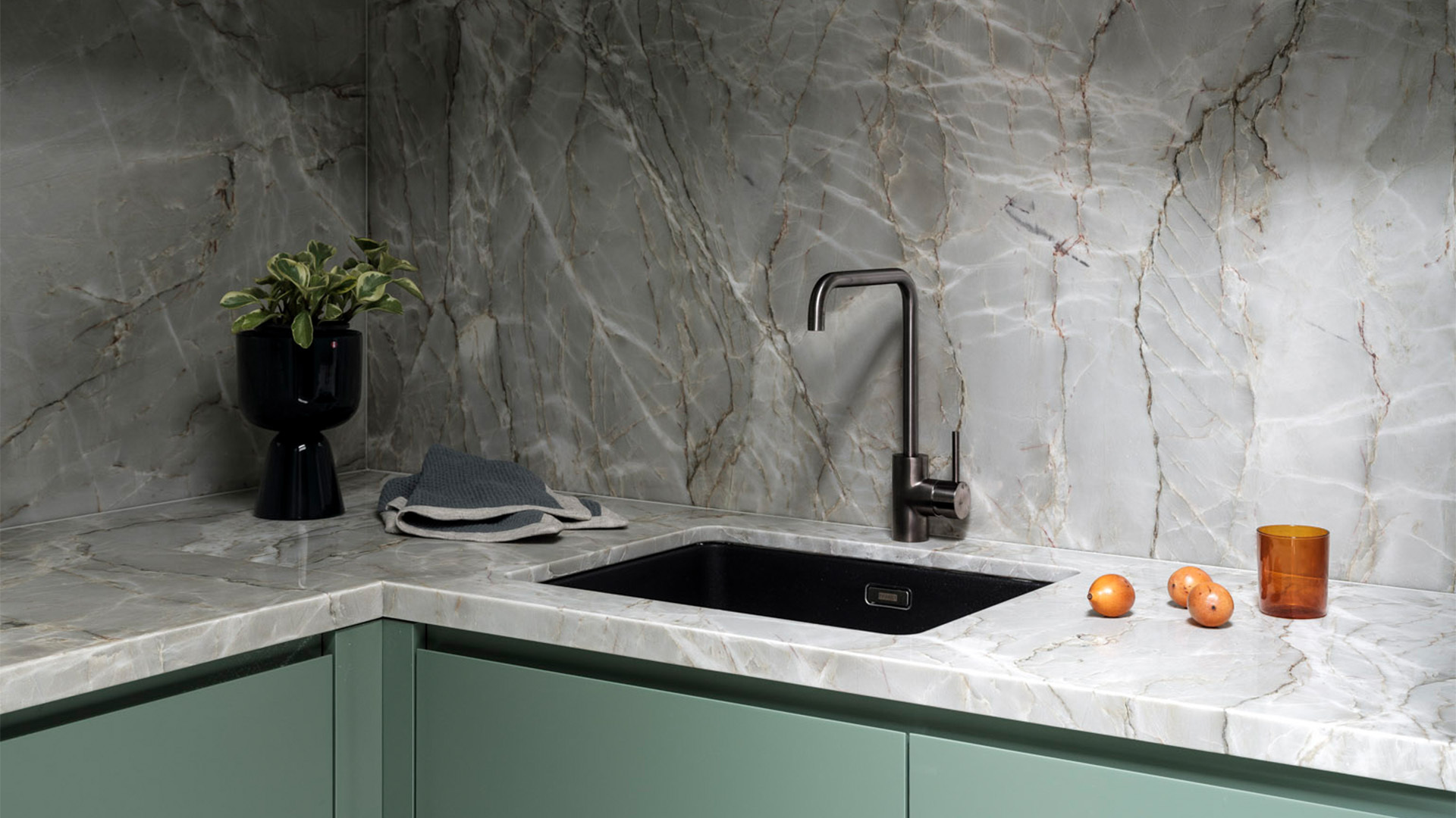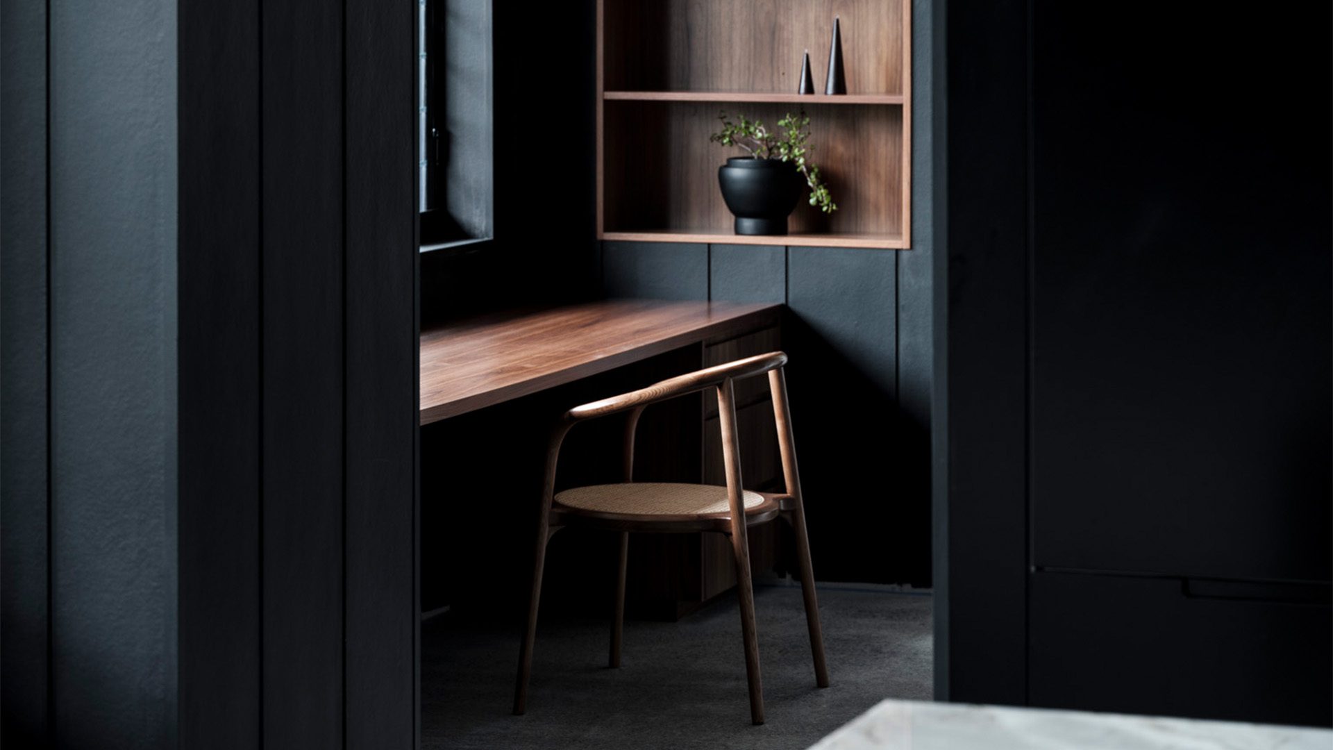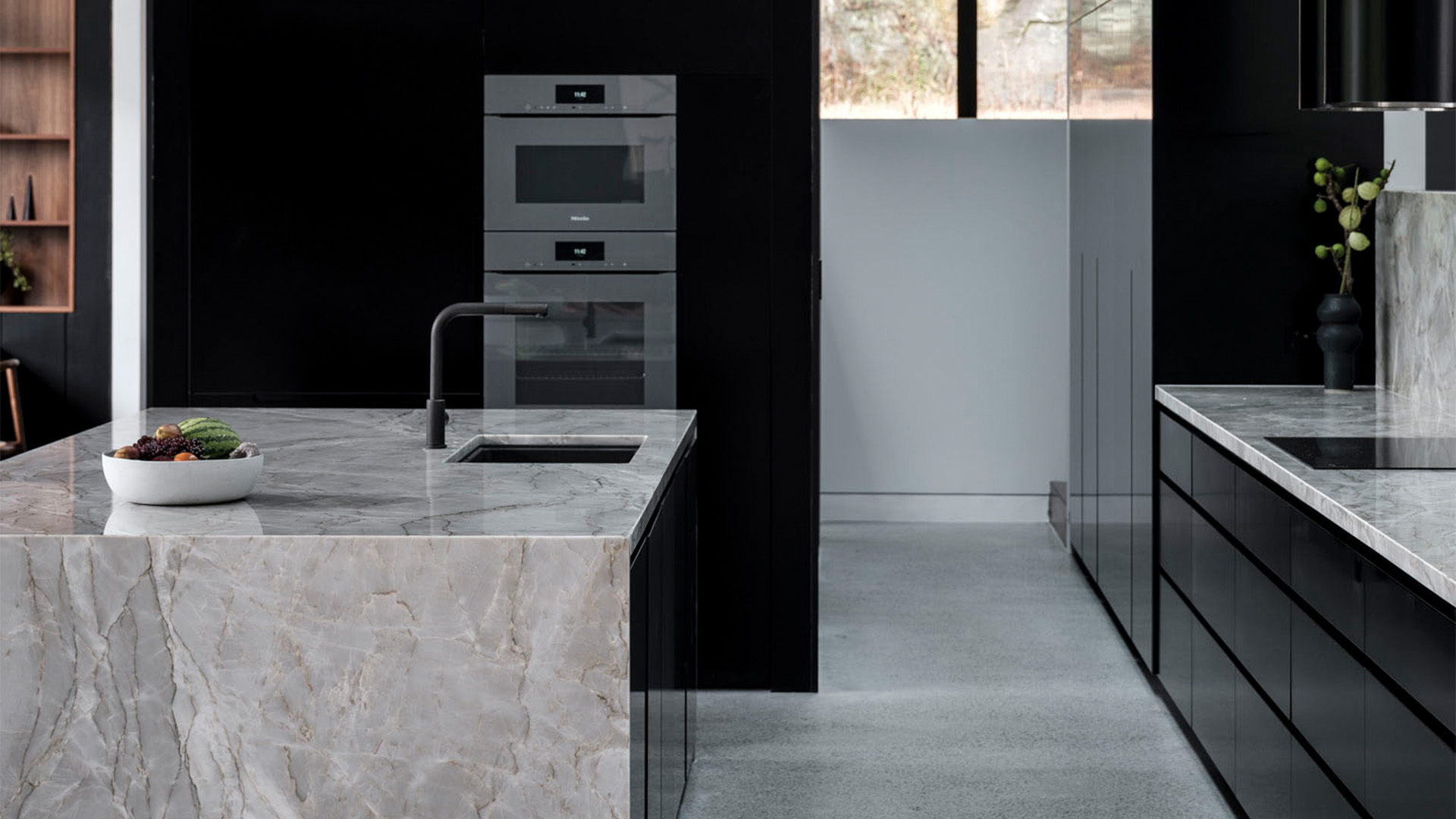 Black offers a sophistication that no other colour can embody. It really masters the defination of both bold and beautiful. The incorporation of a cool marble in this kitchen gives a certain lightness to the space, allowing these two colours to bounce off each other haromoniously. With push to open cabinetry and finger pull draws, a seamless functionality flows through the kitchen. Sometimes the choice of not adding hardware can speak volumes. We followed the tone of joinery throughout the house and by doing this, adding a splash of colour to the laundry became an effortless choice that commented on the natural beauty this home posses.